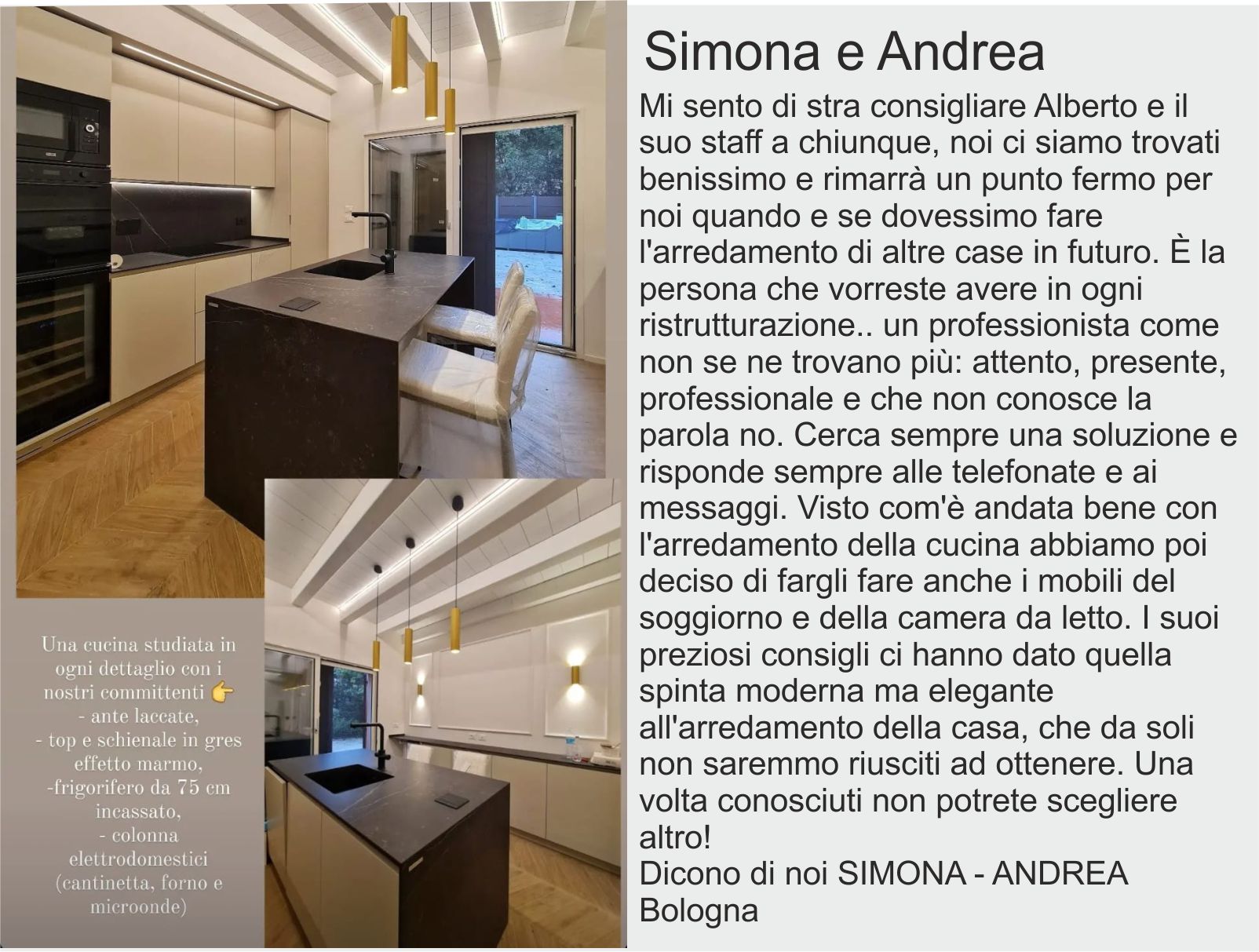 Mi sento di stra consigliare Alberto e il suo staff a chiunque, noi ci siamo trovati benissimo e rimarrà un punto fermo per noi quando e se dovessimo fare l’arredamento di altre case in futuro. È la persona che vorreste avere in ogni ristrutturazione.. un professionista come non se ne trovano più: attento, presente, professionale e che non conosce la parola no. Cerca sempre una soluzione e risponde sempre alle telefonate e ai messaggi. Visto com’è andata bene con l’arredamento della cucina abbiamo poi deciso di fargli fare anche i mobili del soggiorno e della camera da letto. I suoi preziosi consigli ci hanno dato quella spinta moderna ma elegante all’arredamento della casa, che da soli non saremmo riusciti ad ottenere. Una volta conosciuti non potrete scegliere altro!